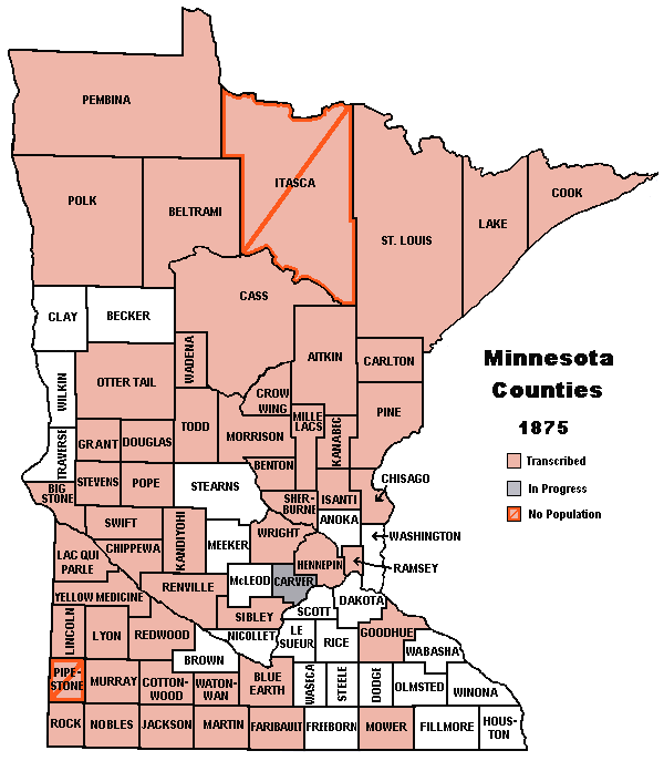 This map shows the Minnesota counties that existed in 1875. It also illustrates the current status of KinSource's transcription of the 1875 Minnesota census.