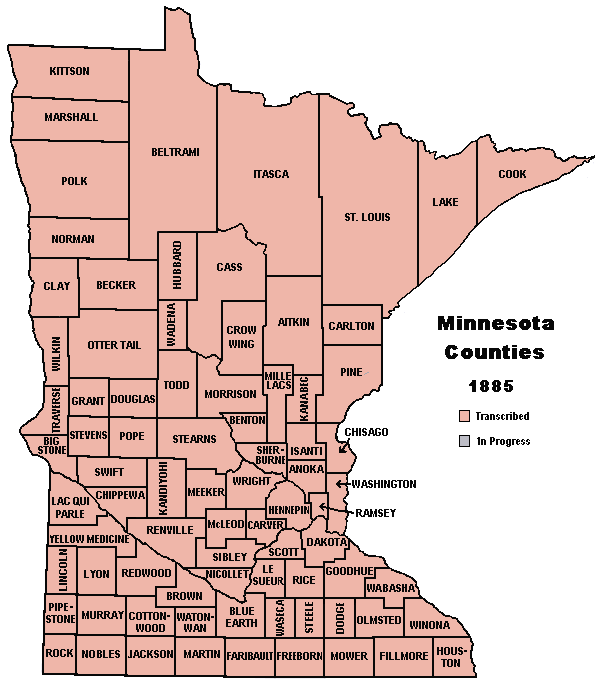 This map shows the Minnesota counties that existed in 1885. It also illustrates the current status of KinSource's transcription of the 1885 Minnesota State Census.